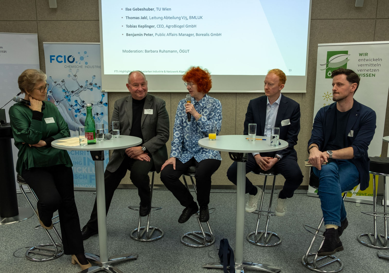 - Diskussionsrunde mit Ille Gebeshuber (TU Wien), Thomas Jakl (BMLUK), Tobias Keplinger (AgroBiogel GmbH), Benjamin Peter (BOREALIS) und Maria Fatima Hettegger (BISC-E-Studierendenwettbewerb)